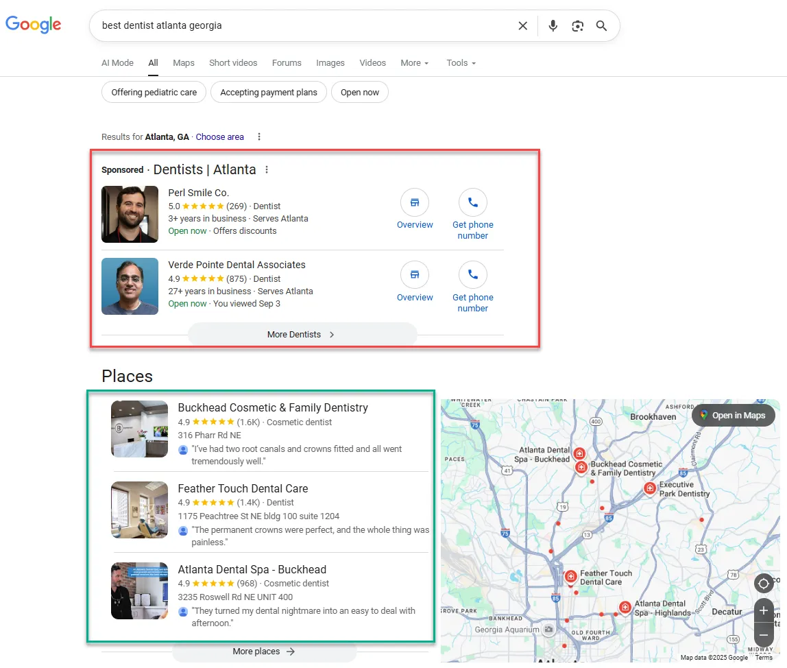 A local wellness practice partnered with Reach Advantage Marketing to dominate both the Local Service Ads (red box above) and the Google Maps Pack (green box above). By combining targeted visibility with automation and reputation tools, we helped them turn searches directly into booked patients.